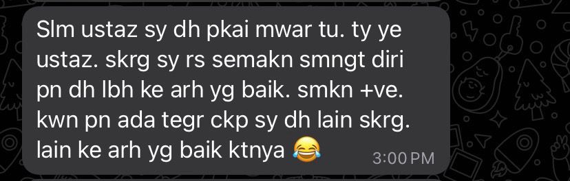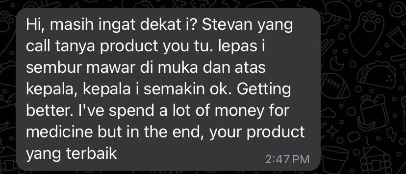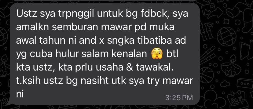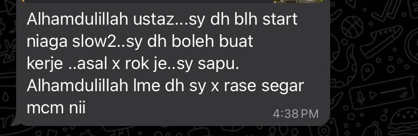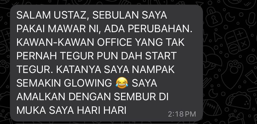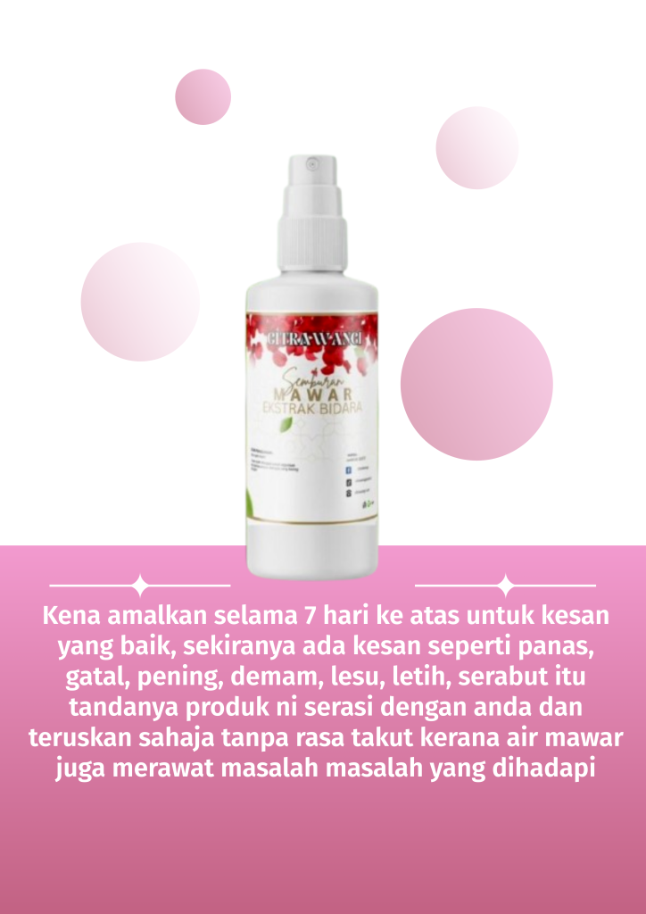 – Kena amalkan selama 7 hari ke atas untuk kesan yang baik, sekiranya ada kesan seperti panas, gatal, pening, demam, lesu, letih, serabut itu tandanya produk ni serasi dengan anda dan teruskan sahaja tanpa rasa takut kerana air mawar juga merawat masalah masalah yang dihadapi