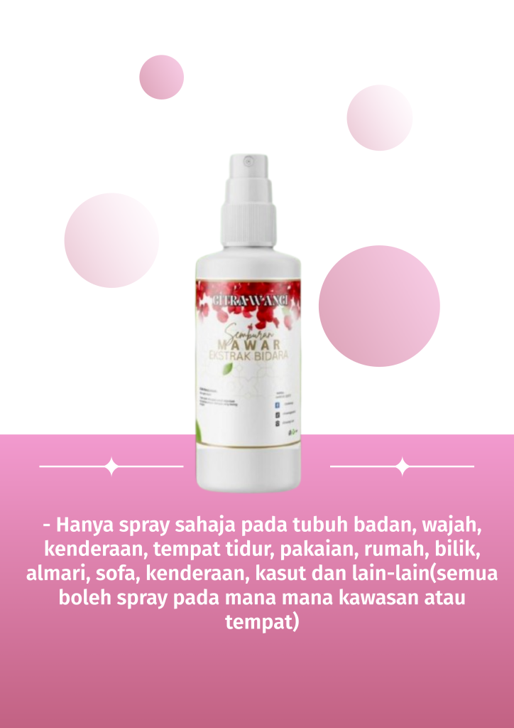 – Hanya spray sahaja pada tubuh badan, wajah, kenderaan, tempat tidur, pakaian, rumah, bilik, almari, sofa, kenderaan, kasut dan lain-lain(semua boleh spray pada mana mana kawasan atau tempat)