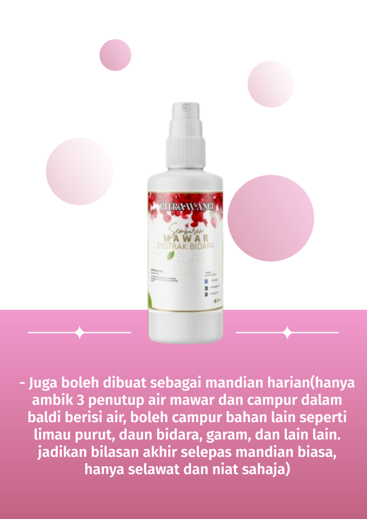 – Juga boleh dibuat sebagai mandian harian(hanya ambik 3 penutup air mawar dan campur dalam baldi berisi air, boleh campur bahan lain seperti limau purut, daun bidara, garam, dan lain lain. jadikan bilasan akhir selepas mandian biasa, hanya selawat dan niat sahaja)